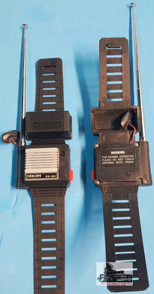 Pareja de walki talkies de pulsera. Transmiten en el canal 14 de CB con 0,1 watios. Una curiosidad.