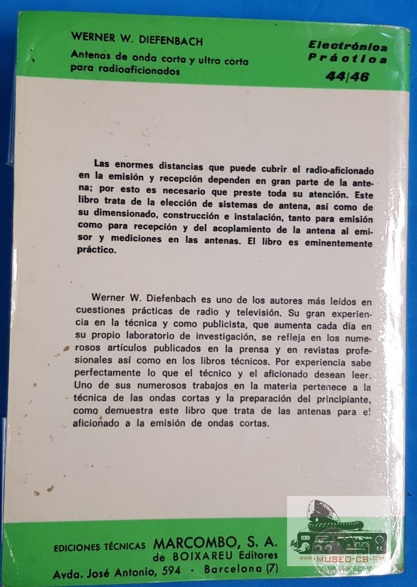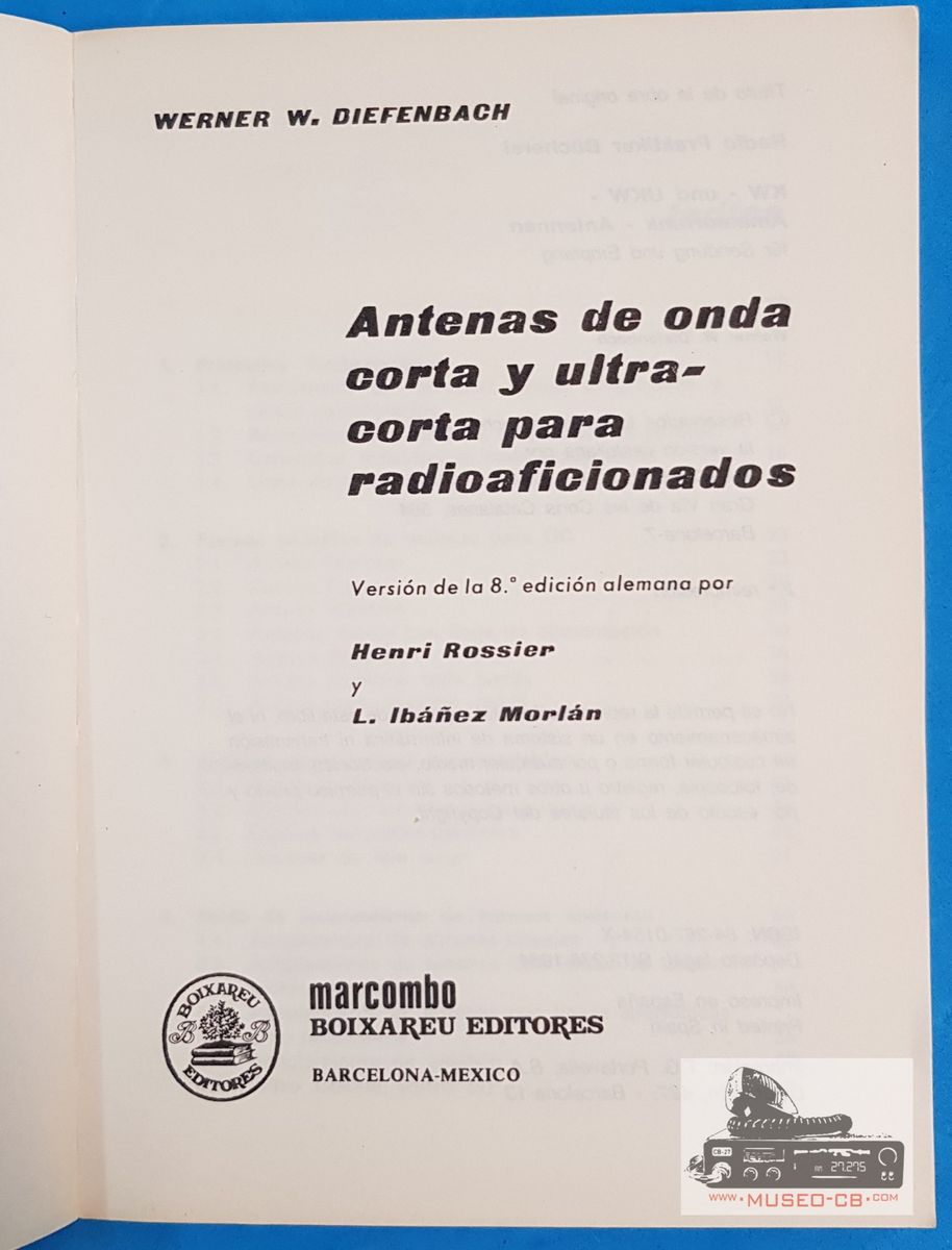 Libro de bolsillo técnico de unas 150 páginas sobre Antenas de onda corta. Editado por Boixerau Marcombo en los años 80 y escrito por Werner W. Diefenbach, con la traducción de Henri Rossier y Luis Ibáñlez Morlan.