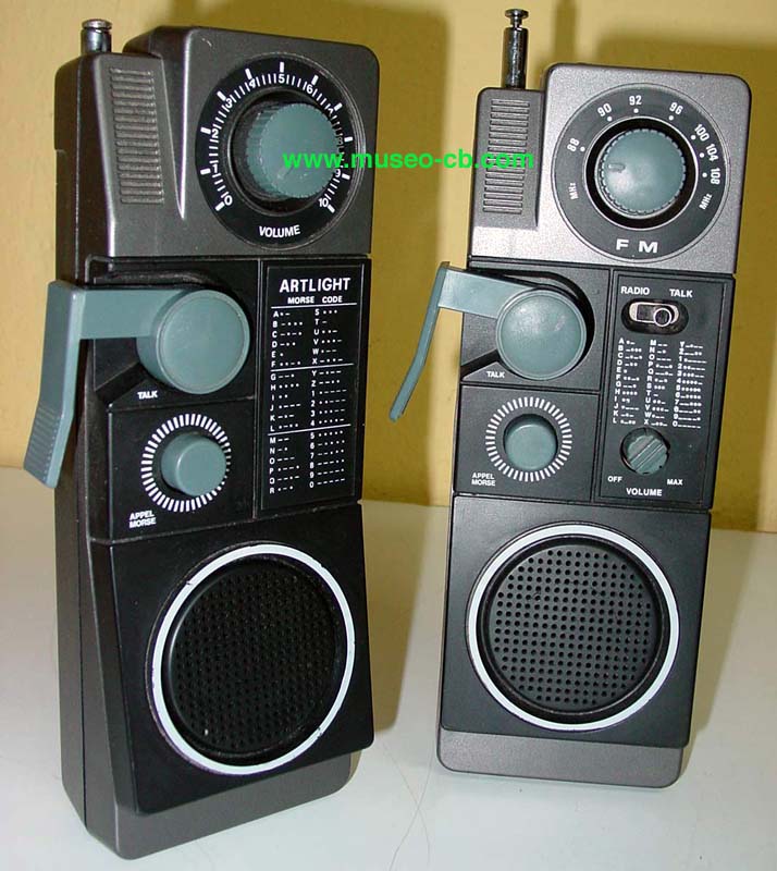 Pareja de walkis, e el que destaca el pulsador PTT y que una de ellas dispone de receptor de radio comercial en FM.