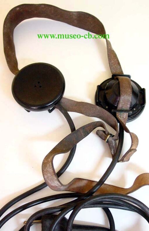 Auriculares del ejército sueco de la Segunda Guerra Mundial. Destaca la correa de cuero, y la clavija de conexión.