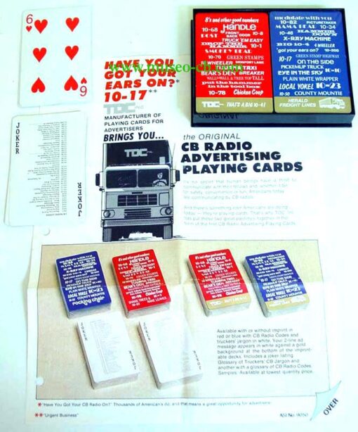Estuche de dos barajas de póker dedicadas a la CB. En la trasera contiene palabras de la jerga cebeista y los comodines son los códigos y jergas utilizados en la CB.