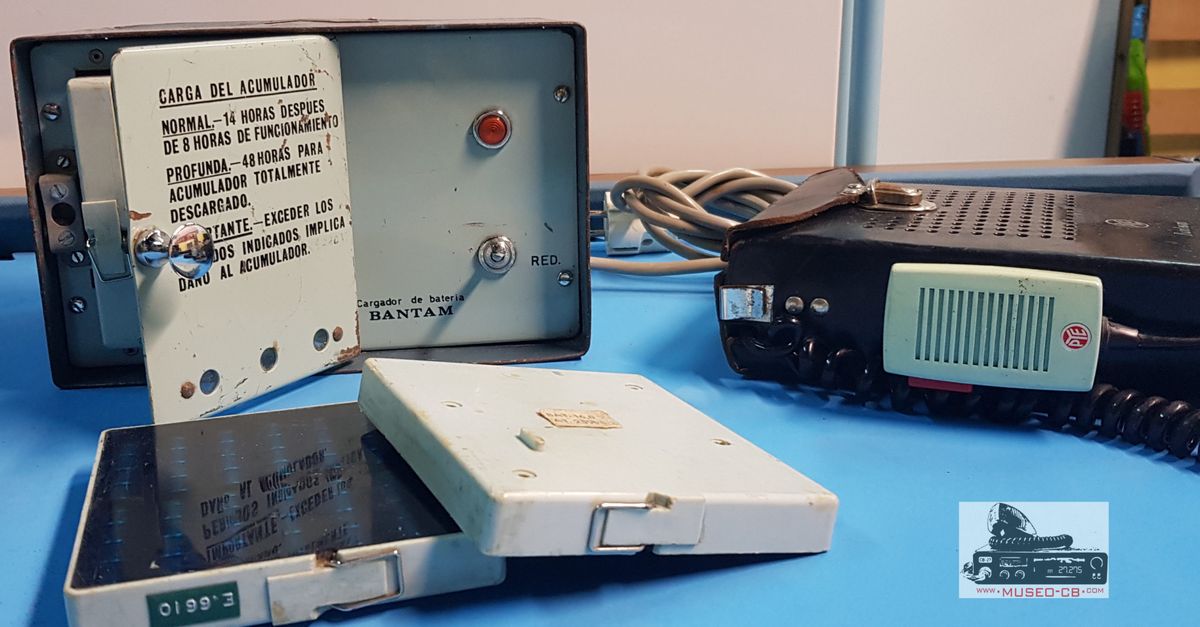 Cargador de 3 baterías de los equipos portátiles Pye Bantam, utilizados desde 1975 por la Guardia Civil en España. Estos equipos podía ser tanto portátiles como instalados en los vehículos, los tradicionales Renault 4 L. El cargador incluye instrucciones de uso y recomendaciones sobre tiempo de carga, etc.