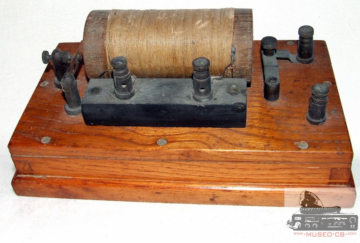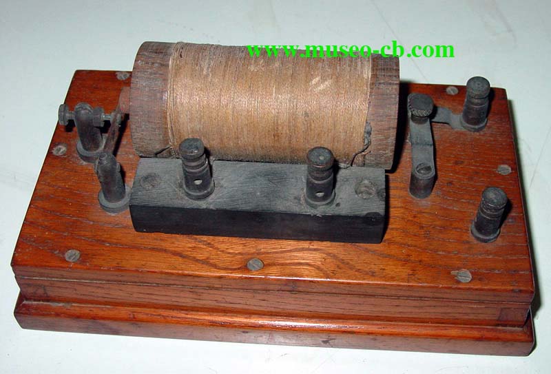 La llamada bobina de inducción o bobina de Ruhmkorff, de invención anterior a la de los transformadores de corriente alterna, es un verdadero transformador polimorfo y elevador, en el que se obtiene, a partir de una corriente primaria continua y de poca fem (pilas o acumuladores), otra de alta tensión y alterna. El carrete está constituido por un núcleo integrado por un haz de hilos de hierro dulce alrededor del cual se arrolla el circuito primario que es un alambre de cobre grueso y relativamente corto, de pocas vueltas, y por encima de este, convenientemente aislado, se arrolla el circuito secundario, hilo delgado y de mucha longitud (muchas vueltas) cuyos extremos están formando los llamados polos del aparato. En sus aplicaciones se encuentra la radio. Hertz, profesor de la Universidad de Bonn (1857-1894) llevó a la práctica la teoría de Maxwell. El desafío para Hertz consistió en inventar el transmisor y el receptor. El emisor estaba constituido por un carrete de Ruhmkorff de grandes dimensiones al que adapto una especie de antena dipolo. El receptor, muy poco sensible, consistía en un anillo abierto, entre cuyas puntas podían saltar chispas. Esta importante pieza, sin duda la más antigua de Museo CB, fue donada a museo CB por Antoni Millán, de Villanova y la Geltrú