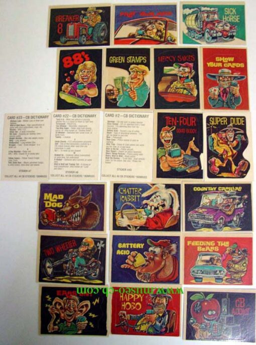 Curiosa colección de 44 tarjetas realizadas por Don Russ. En la parte delantera se muestran pegatinas de caricaturas relacionadas con la CB, mientras que en la parte de atrás de cada tarjeta se relaciona un completo “diccionario” del argot utilizado en CB en los 70 en Estados Unidos.