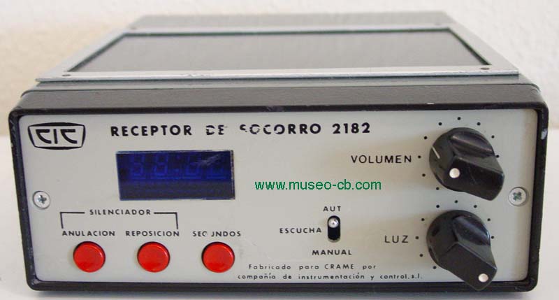 Receptor de socorro en la frecuencia 2182 Mhz. Construido en España por la Compañía de Instrumentación y Control S.L. para CRAME. Se alimenta a 24 voltios y posee un reloj.