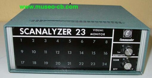 Curiosísimo y raro, muy raro, analizador de espectro para CB, que indica en qué canal se está transmitiendo y en cual no. Al ser de 1975, sólo marca los 23 canales autorizados en esa época.