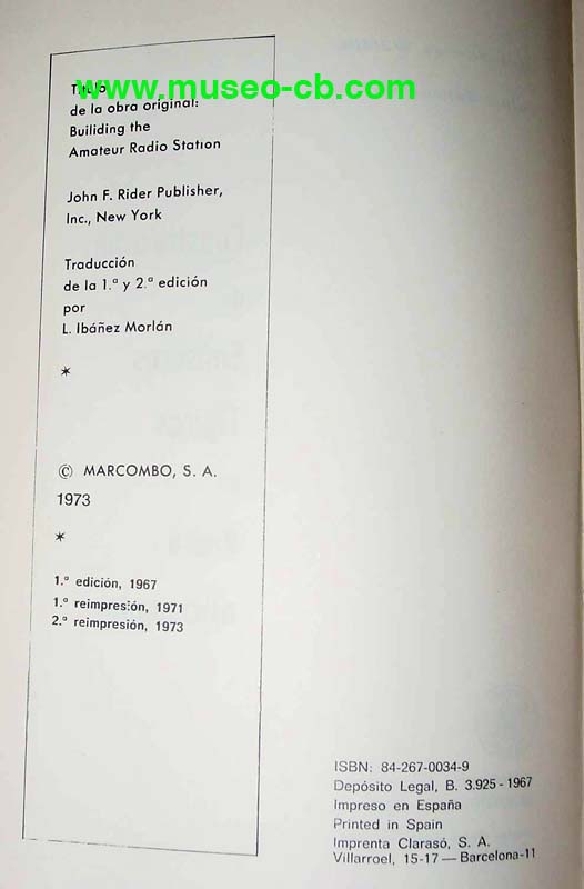 El libro fue traducido por L Ibañez Moelán del original de Jack y Lulius Berens (W2MDL y W2PIK). Editado por Marcombo Boixereu Editores.
