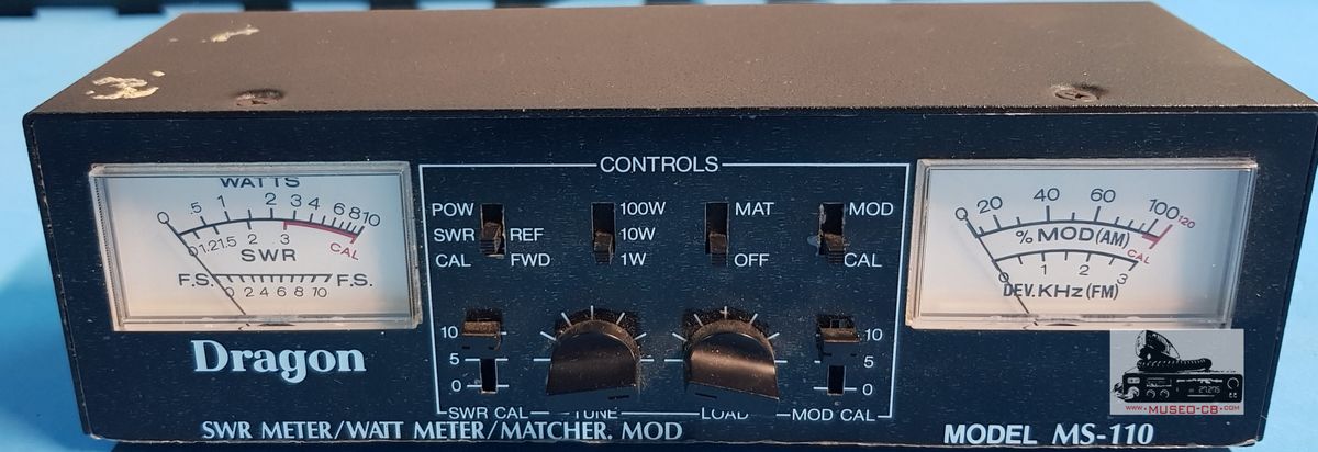 Medidor de SWR, modulación y potencia y acoplador hasta 100 watios. Con dos relojes y potenciómetros de calibración deslizantes.
