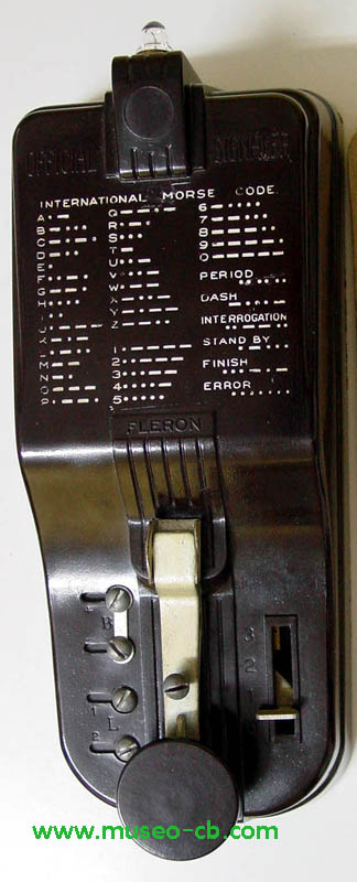 Entrenador de telegrafía. Dispone de una lamparita, alimentada por dos pilas de 1,5 voltios y serigrafiado el alfabeto morse.