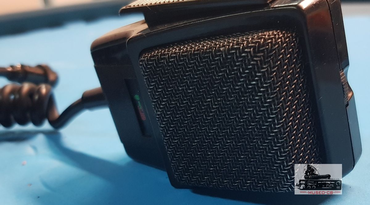 Micrófono de mano amplificado. Se alimenta con una pila de 9 volt y dispone un potenciómetro en la parte superior del mismo.