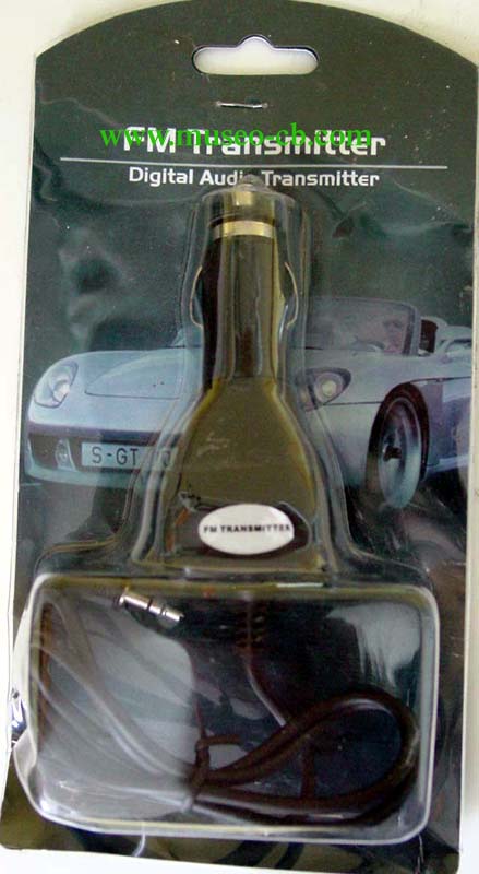 Transmisor de FM en banda comercial. Inicialmente pensado para escuchar en la radio del coche música procedente de un MP3. Con una leve modificación, cambiando la clavija estéreo por una mono, y conectándola a la salida de altavoz de la emisora, sirve para escuchar por los altavoces del coche la radio de CB. (instalado en el vehículo de arl100)