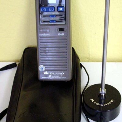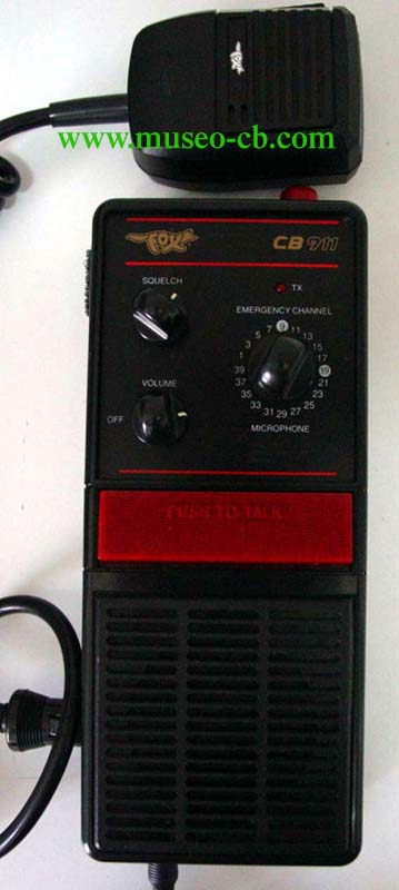 Emisora de emergencia de Fox. Incluye la emisora de 40 canales, una toma para antena de goma, otra para antena exterior y conector de alimentación al mechero del coche. Lleva señalado el canal 9 de emergencia y carece de S-meter.