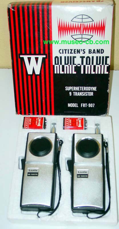 Pareja de pequeños aunque pesados walkis miliwáticos. Con 9 transistores. Sin marca. Viene en su caja original, incluídas las pilas de 9 voltios de la época.