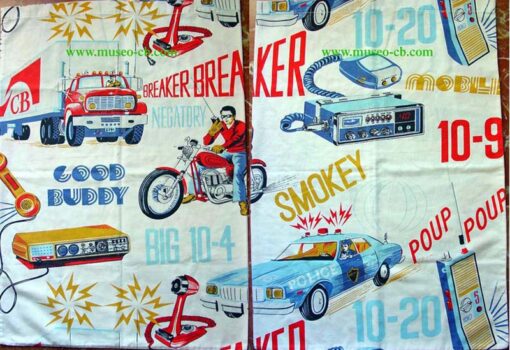 Curiosa funda de Almohada de 90 cms decorada con motivos de la CB. Es de algodón y debe datar de los años 80. Se desconoce si pertenecía a un juego completo de sábanas.
