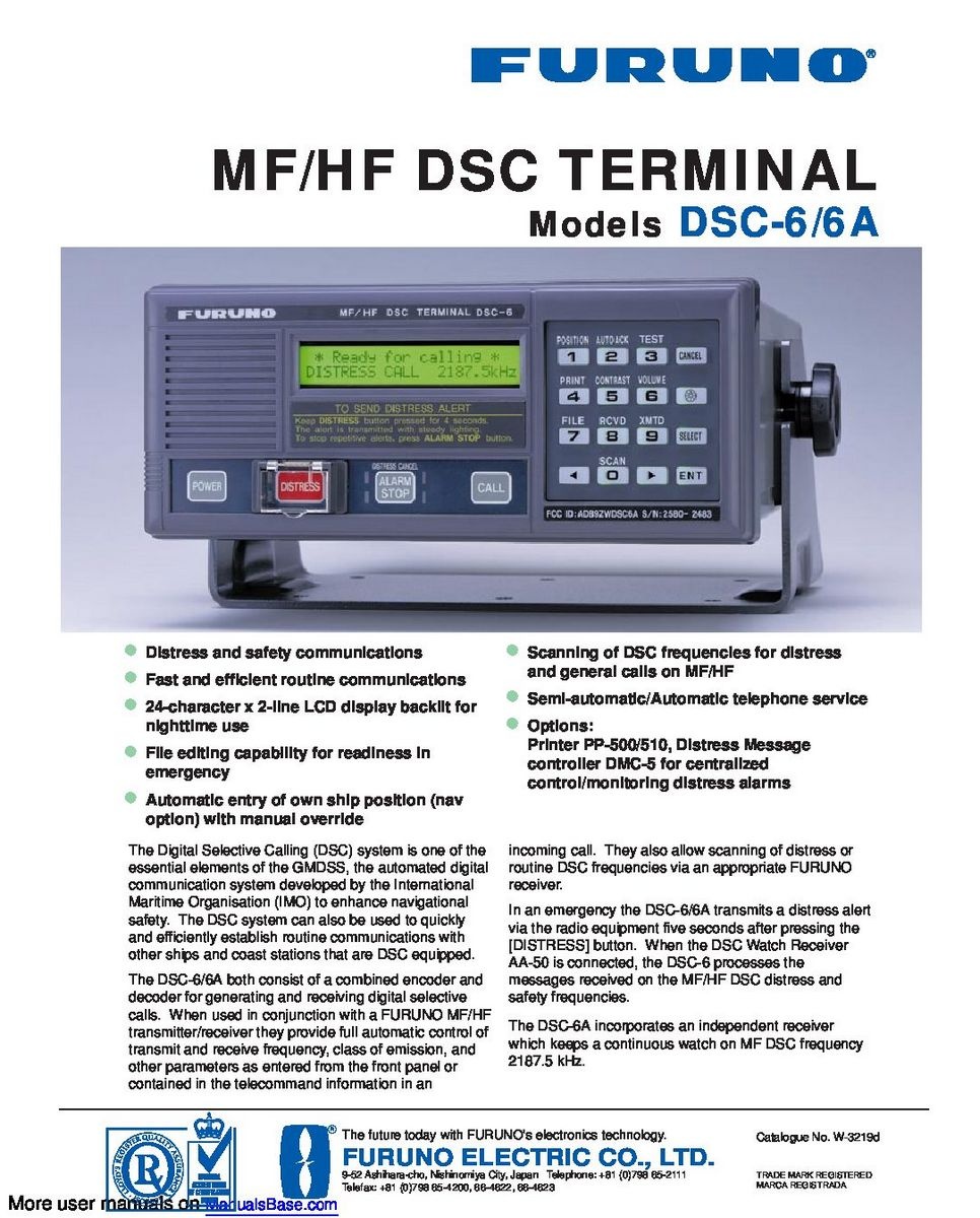 El DSC-6 / 6A consta de un codificador y un decodificador combinados para generar y recibir llamadas selectivas digitales. Cuando se usan junto con un transmisor / receptor FURUNO MF / HF, proporcionan un control automático completo de la frecuencia de transmisión y recepción, clase de emisión y otros parámetros ingresados desde el panel frontal o contenidos en la información de telecomando en una llamada entrante. También permiten escanear las frecuencias DSC de socorro o de rutina a través de un receptor FURUNO apropiado.