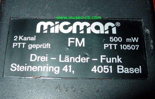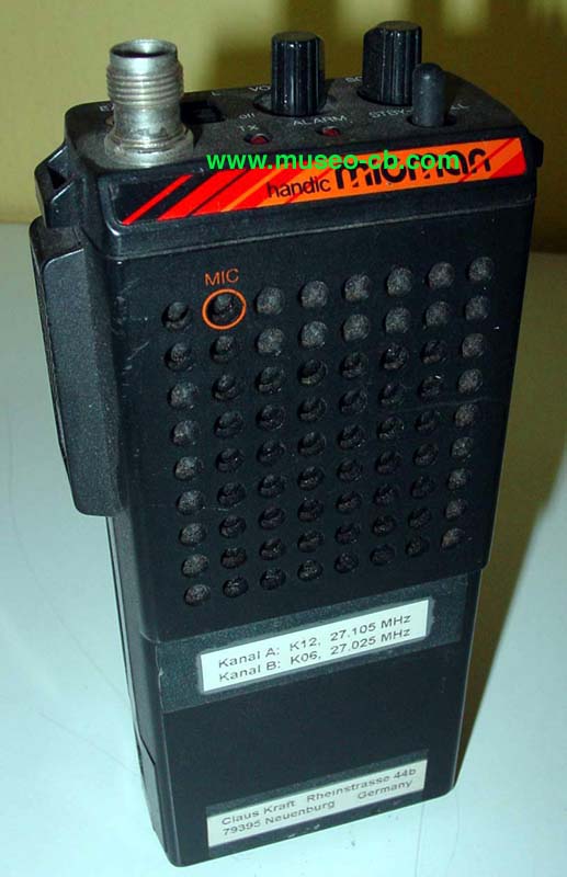 Walki de poca potencia Handic, que se aleja del color naranja habitual, aunque lo lleva en un detalle de marca y modelo en el frontal. Medio watio en FM y dos canales.