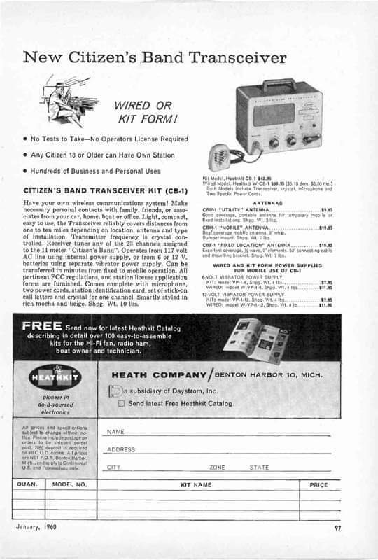 Equipo a válvulas, quizás una de las primeras emisoras de CB construida en el mundo. Data de junio de 1959. Incorpora VFO para la recepción de los 23 canales de la banda, y los canales de transmisión lo obtiene a través de cristales de cuarzo.