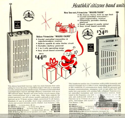 Kit de walki talkie americano, En la publicidad decía que alcanzaba más de una milla (1,2 kilómetros). De pequeño formato, tiene 4 transistores. El modelo de Museo CB es de julio de 1964, aunque comenzaron a fabricarse en 1961. Entonces, la versión kit costaba 24,95 dolares, subiendo a 37,75 si se compraba ya montado. Lleva el botón de volumen y encendido en el frontal.