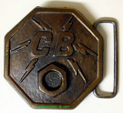 Hebilla de un cinturón, en el que se resaltan los lemas: cb y unos rayos