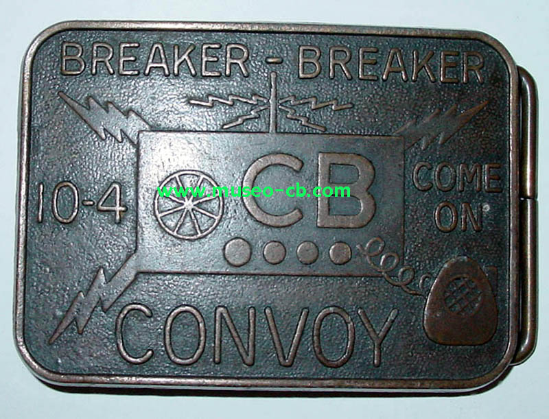 Hebilla de un cinturón, en el que se resaltan los lemas: cb, 10-4 y breaker breaker