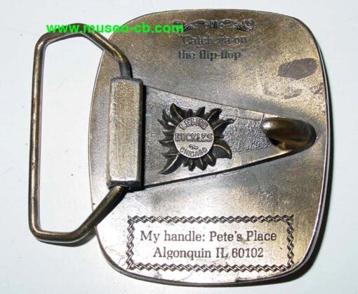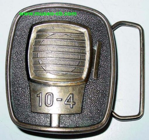 Hebilla de cinturón con la imagen de un micro y el lema 10-4. Construído en Chicago por Lewis Buckles.