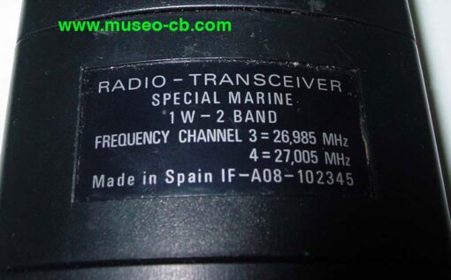 Walki español de dos canales y un watio. Indica que es un walki especial para Marina. Tiene de serie instalados los canales 3 y 4. Destaca su altavoz, que sobresale del resto del walki.