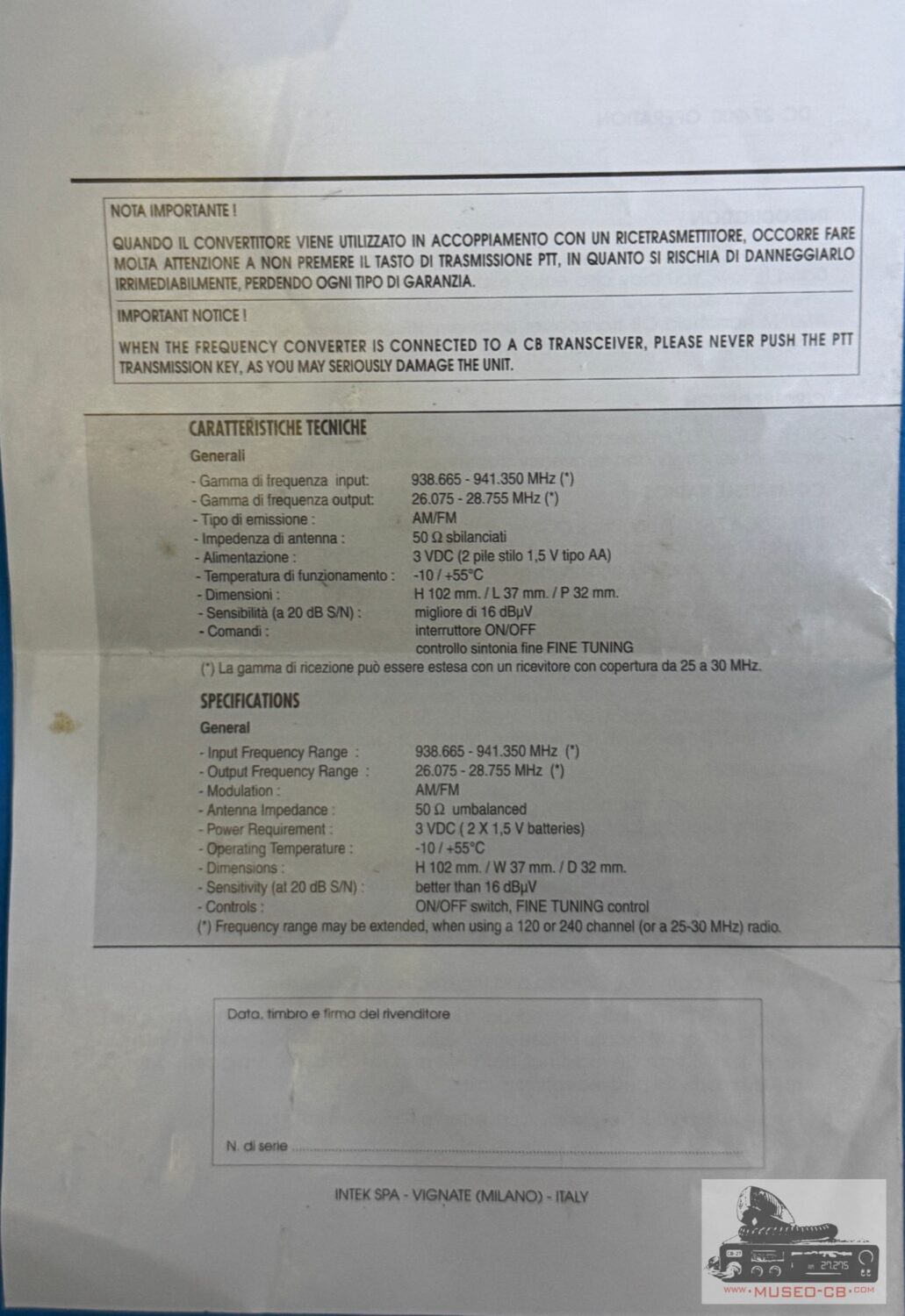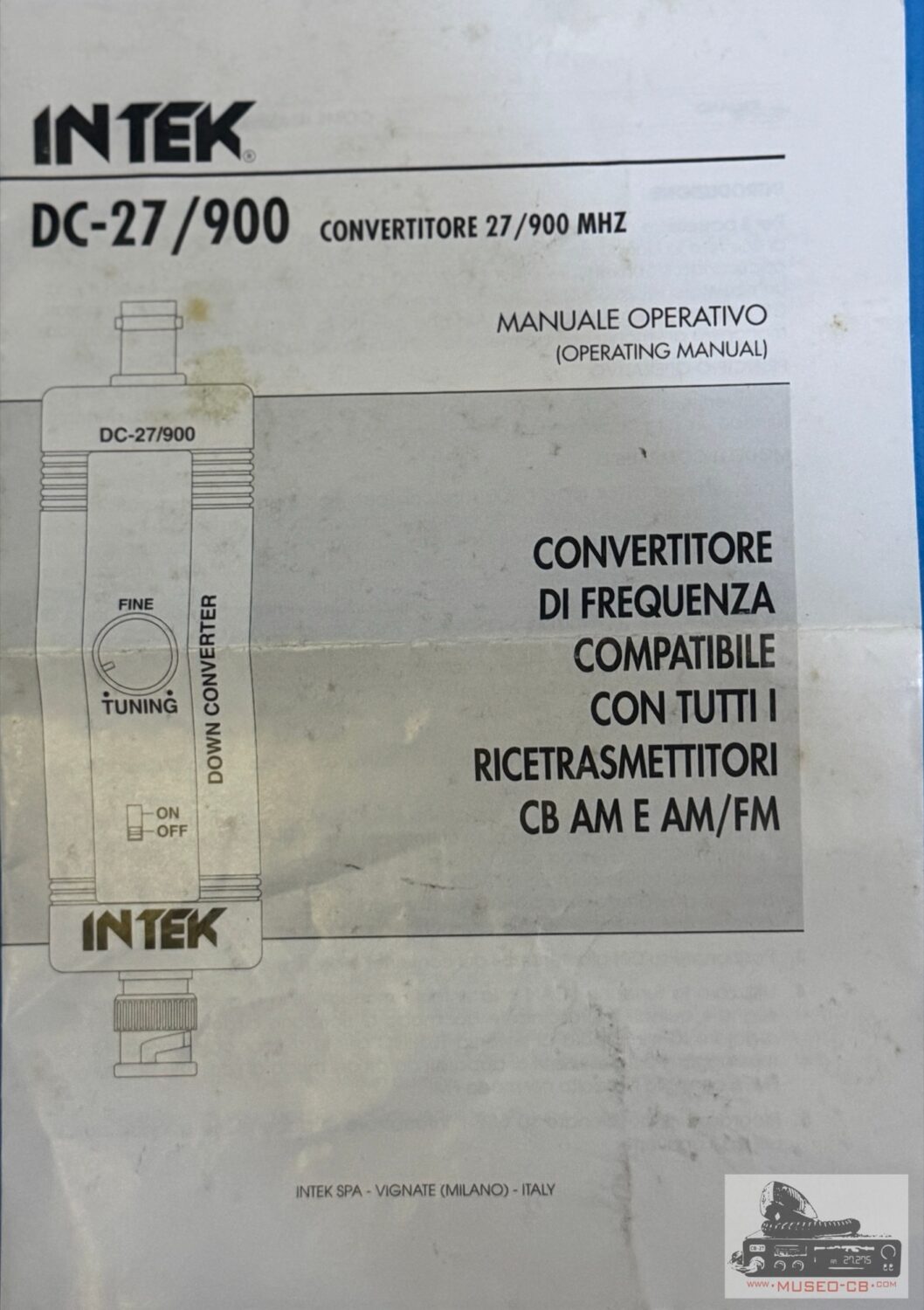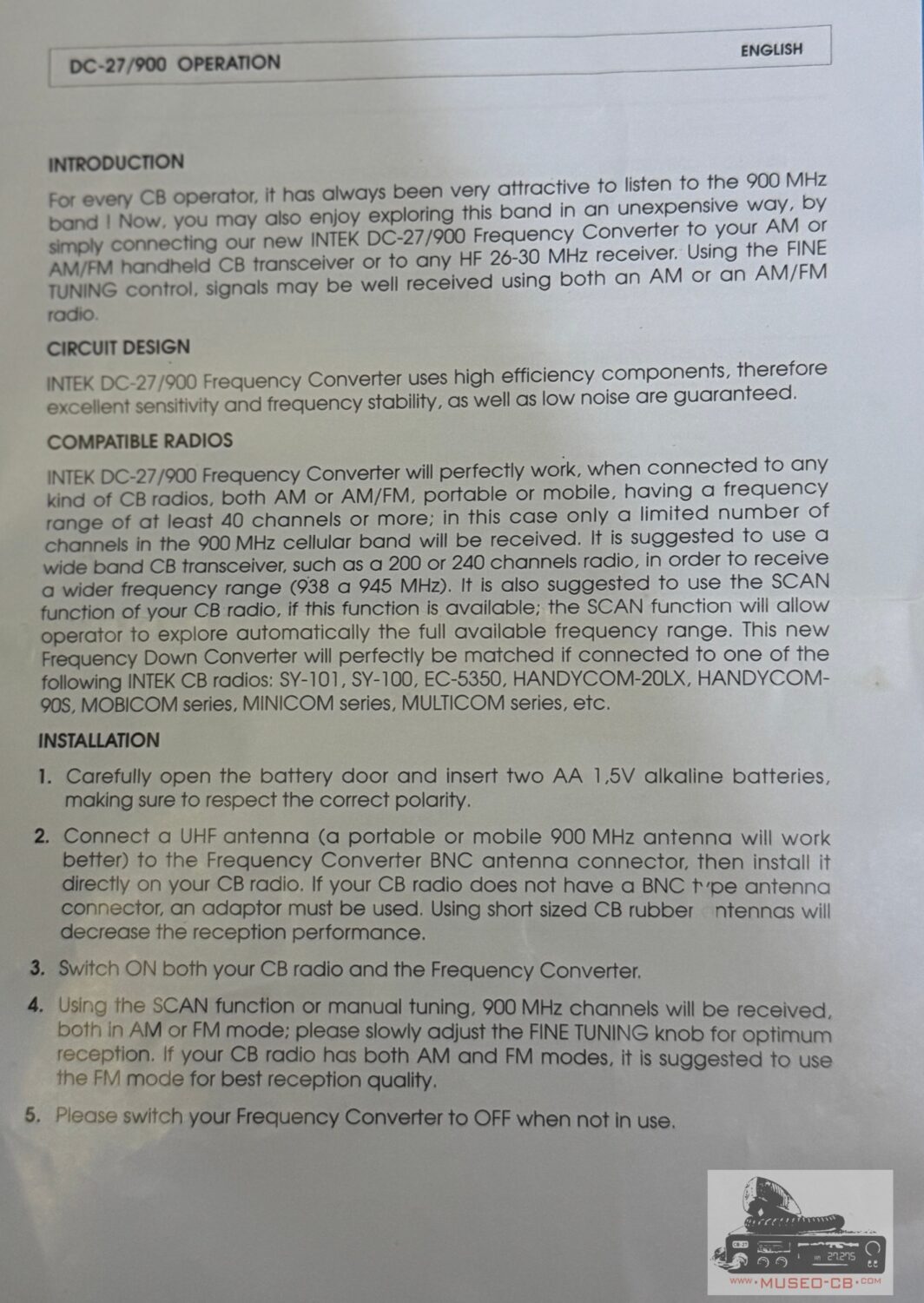 El convertidor de frecuencia INTEK DC-27/900 funcionará perfectamente, cuando esté conectado a cualquier tipo de radio CB, tanto AM como AM/FM, portátil o móvil, con un rango de frecuencia de al menos 40 canales o más; en este caso, solo se recibirá un número limitado de canales en la banda celular de 900 MHz. Se sugiere usar un transceptor CB de banda ancha, como una radio de 200 o 240 canales, para recibir un rango de frecuencia más amplio (938 a 945 MHz). También se sugiere usar la función SCAN de su radio CB, si esta función está disponible; la función SCAN permitirá al operador explorar automáticamente el rango de frecuencia completo disponible. Este nuevo convertidor de frecuencia descendente se combinará perfectamente si se conecta a una de las siguientes radios INTEK CB: SY-101, SY-100, EC-5350, HANDYCOM-20LX, HANDYCOM-90S, serie MOBICOM, serie MINICOM, serie MULTICOM, etc.