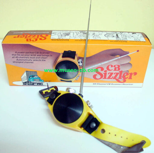 Curioso receptor de 40 canales de CB en forma de reloj. Se alimenta con una pila de 1,5 voltios. Tiene una pequeña antena telescópica y botón de encendido y volumen. Escucha la señal más fuerte. Con su caja original.