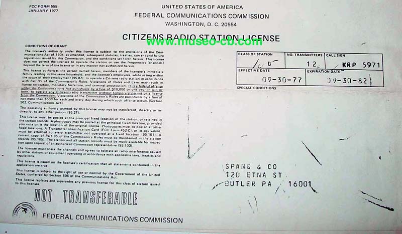 Licencia de CB que otorgaba la FCC (Federal Cominication Comission). Esta es de la estación KRP5971. Válida desde el 30 de septiembre de 1977 al 30 de septiembre de 1982. Ya la CB en Estados Unidos es libre y no es necesario licencia.