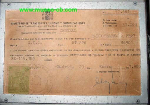 Curiosamente, la licencia está otorgada en enero de 1985 para un radiotelefóno PR27, a pesar que la CB ya estaba legalizada desde agosto de 1983.