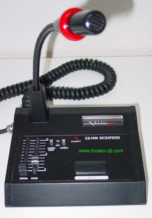Micrófono amplificado de base con eco y Roger Beep. Dispone de un V-Meter para medir la modulación.