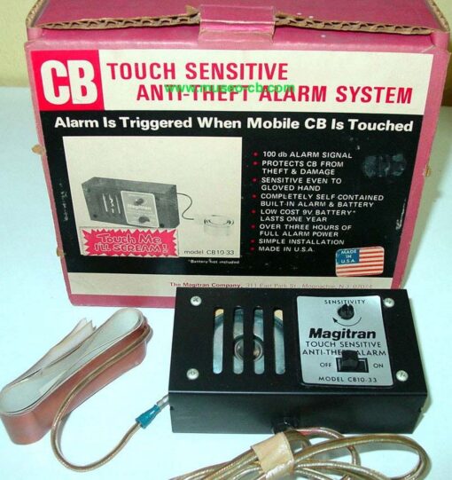 Curioso artilugio para evitar el robo de equipos de CB. La alarma se fija con una cinta alrededor del equipo, y si alguien toca el equipo salta la alarma.