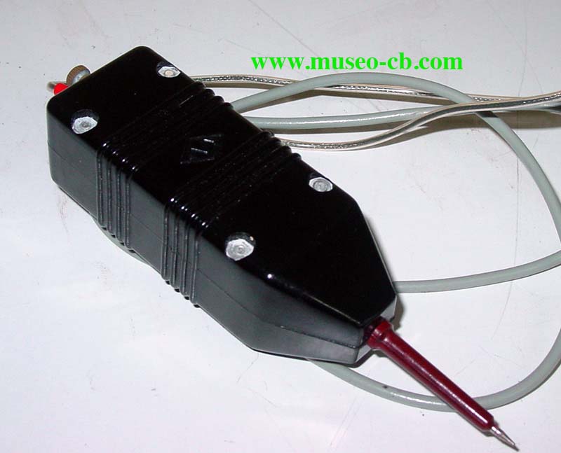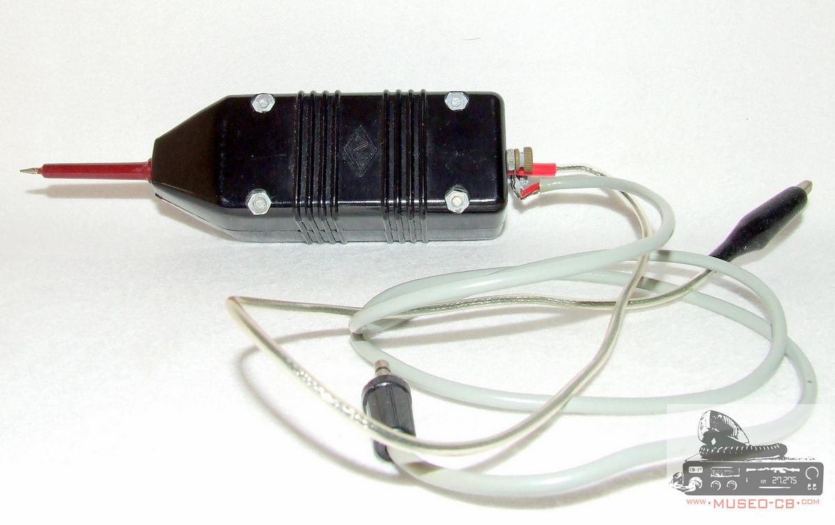 Punta de radiofrecuencia (RF) o medidor/detector de tensión continua de señal de radiofrecuencia de los años 50. La sonda hará seguir la señal que detecte, ya sea de RF o BF, hacia el dispositivo de audio. Cualquier sonda detectora que se acople correctamente al dispositivo de audio sirve perfectamente. Si la toma es en un punto de RF, la sonda demodula la señal convirtiendola en BF, y si la toma es en un punto de BF la sonda simplemente da paso a la señal. El Signal Tracer se utiliza para hacer un seguimiento de la señal y así averiguar el paso que falla en un receptor o en un amplificador, pero en general no indicará el componente averiado. La parte más importante del signal-tracer es la sonda, en realidad la sonda es el signal-tracer. De la marca Maymo, proveedor de materiales de radio y escuela de radiofrecuencia que lleva más de 70 años instruyendo. Fernando Maymó Gomis era natural de la localidad gerundense de Llangostera. Fernando Maymó inició en el año 1941 el sistema de enseñanza a través del correo. Fundó así la primera Escuela de Radio por correspondencia en España, cuya sede central se encontraba en Barcelona. El alumno durante el curso realizaba montajes prácticos498. Consistían tanto de circuitos puramente radiofónicos (receptor experimental con diodo de germanio, con retroalimentación, un amplificador de baja frecuencia y un superheterodino de AM/FM a válvulas, de alimentación indistinta) como aparatos de medida y ajuste, tales como un tester y un generador de señales de radiofrecuencia. Las prácticas se realizaban con materiales suministrados por la Escuela. La Escuela funcionó hasta los primeros años setenta. Los contenidos apenas variaron respecto al programa original del año 1947. Es un kit montado por Antoni Millán Franco de Vilanova y la Geltrú, Barcelona, que la donó al Museo de la CB.