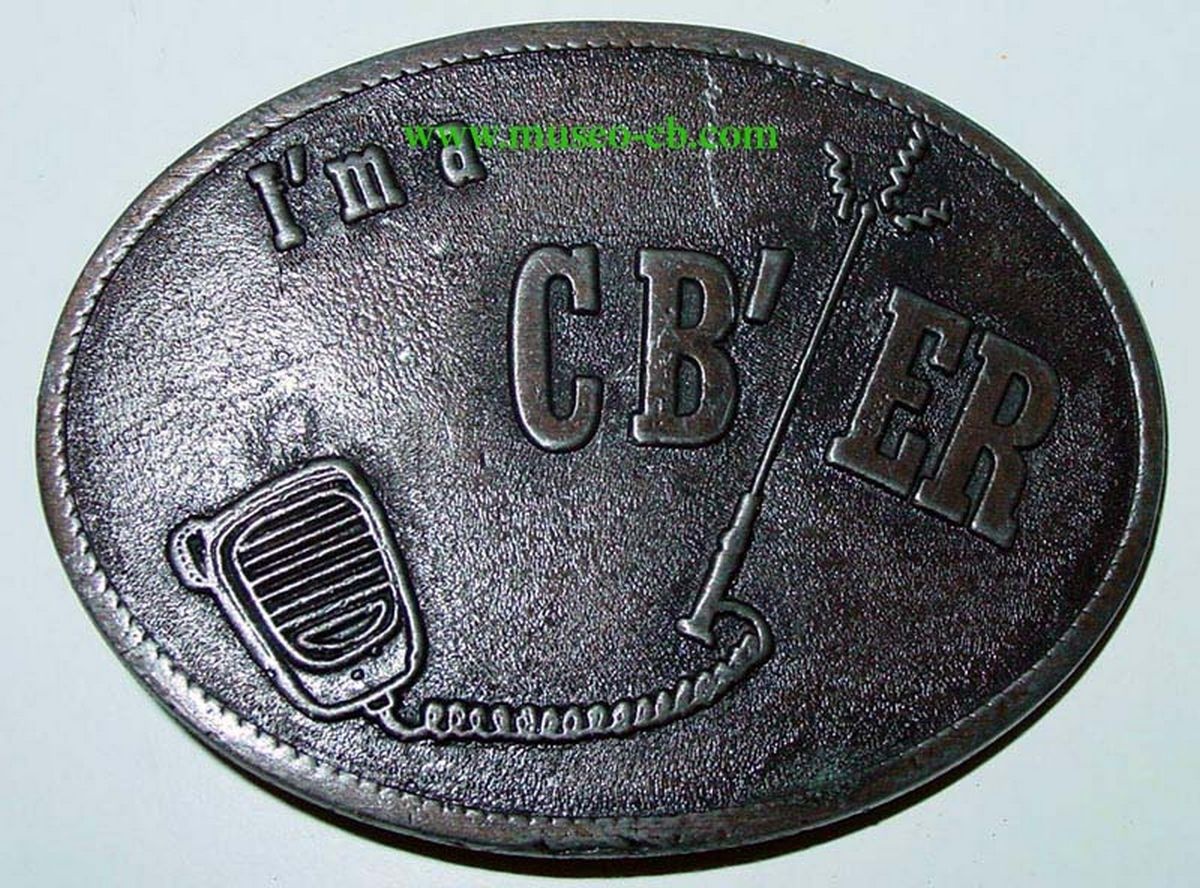Reducida metopa con la leyenda en inglés “Soy un cebeísta”, adornada con un micro y una antena