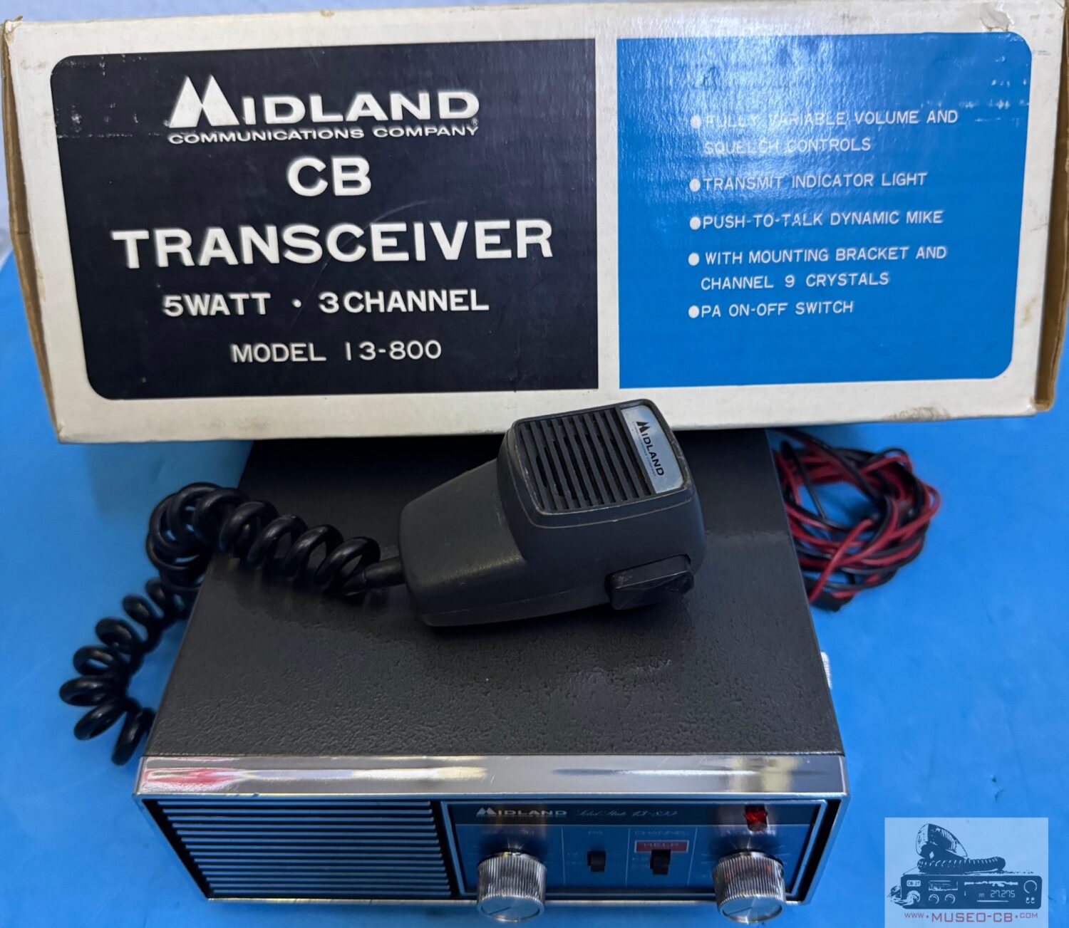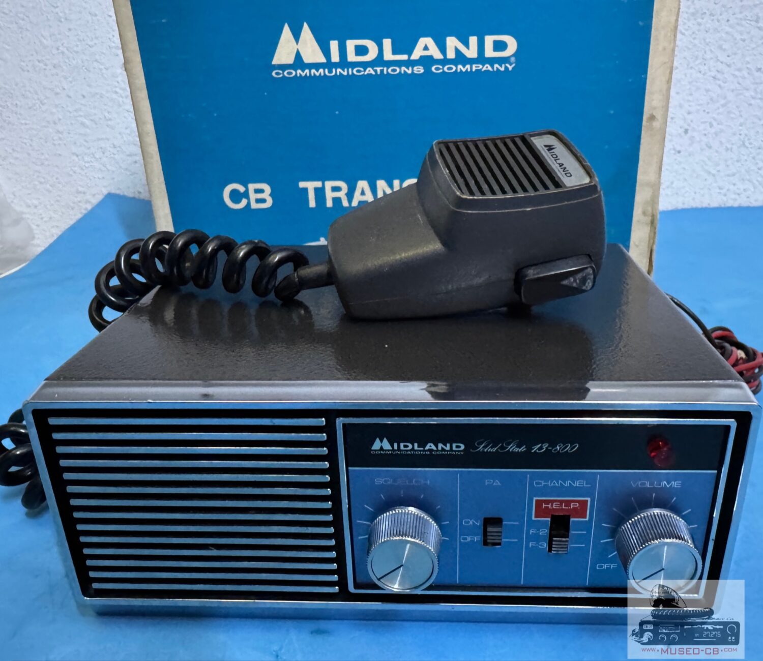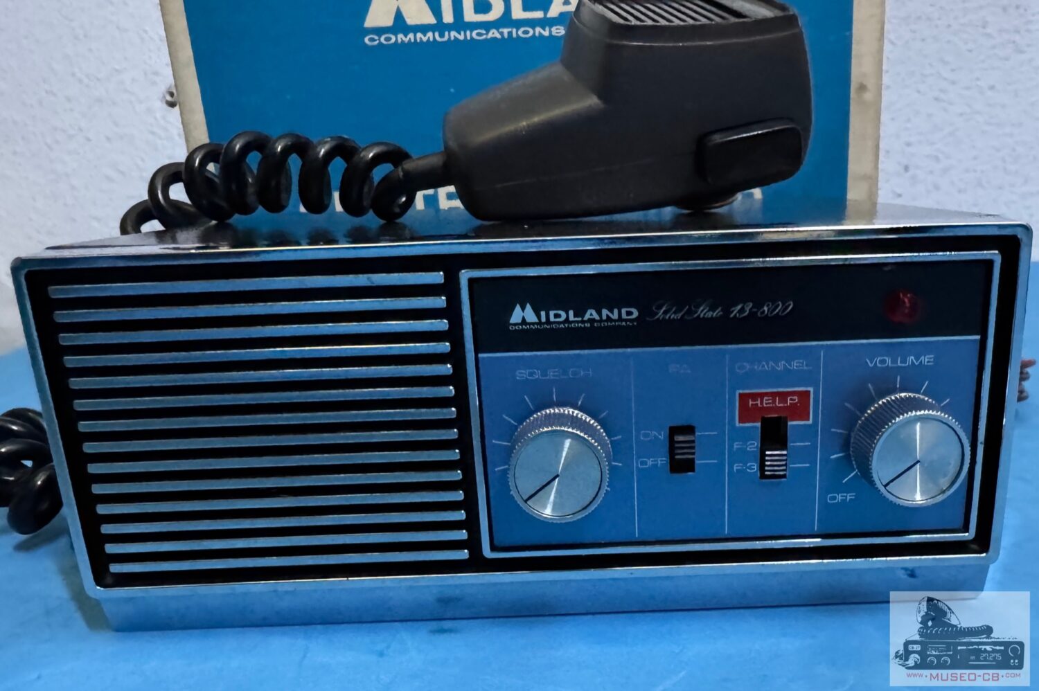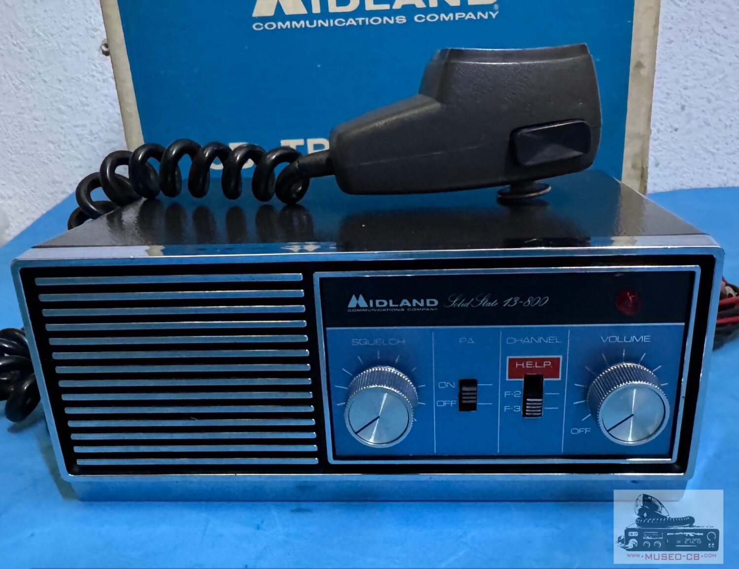 Equipo sencillo de los años 70 de CB, con 3 canales a cristales de cuarzo, uno de ellos el canal 9, indicado e el selector como Help. Altavoz frontal.