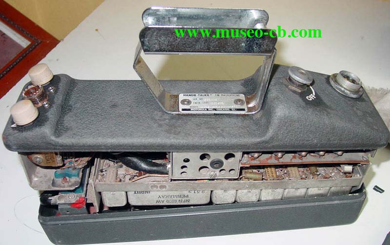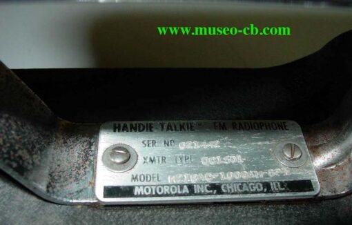 Curioso ejemplar de los primeros walkie talkies o Handie talkies de Motorola Aunque el modelo en cuestión es de VHF, Motorola fabricó uno en 1959 que operaba con watios entre 25 y 54 Megaciclos. Al Motorola le falta la carcasa exterior y el microauricular, pero no deja de ser un equipo muy interesante. Regalado a Museo CB en Mercaham 2010 por EA3FMP, Antonio, conocido en Barcelona como "El chatarrero".