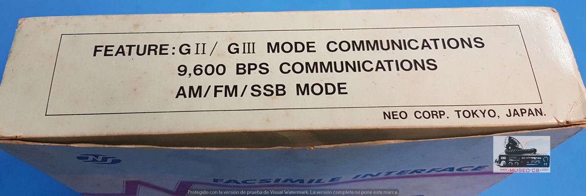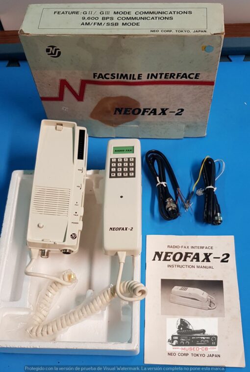 Curioso aparato poco visto. Se trata de un interface para poder enviar fax a través de radio. Se conecta a cualquier emisora y puede funcionar, a 9600 bps, en AM, FM o SSB. Tiene un teléfono y las conexiones para la emisora y el aparato de fax. Las instrucciones están en japonés.
