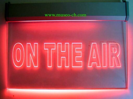 Neón de color rojo que ilumina un metacrilato de tamaño folio (A4) con la inscripción “On the Air”. Se alimenta a 220 voltios.