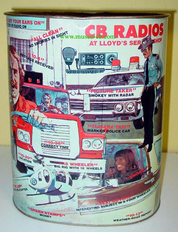 Papelera de oficina decorada con motivos de la CB. Incluye la descripción de la jerga USA de CB