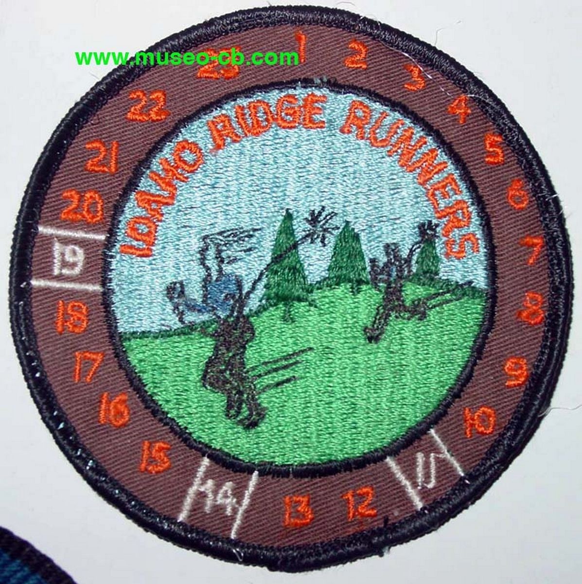 Parche en tela del Club Idaho ridge runners (algo así como corredores de las montañas). Se ven claramente los 23 canales y dos personas coorroendo con antenas y equipos.