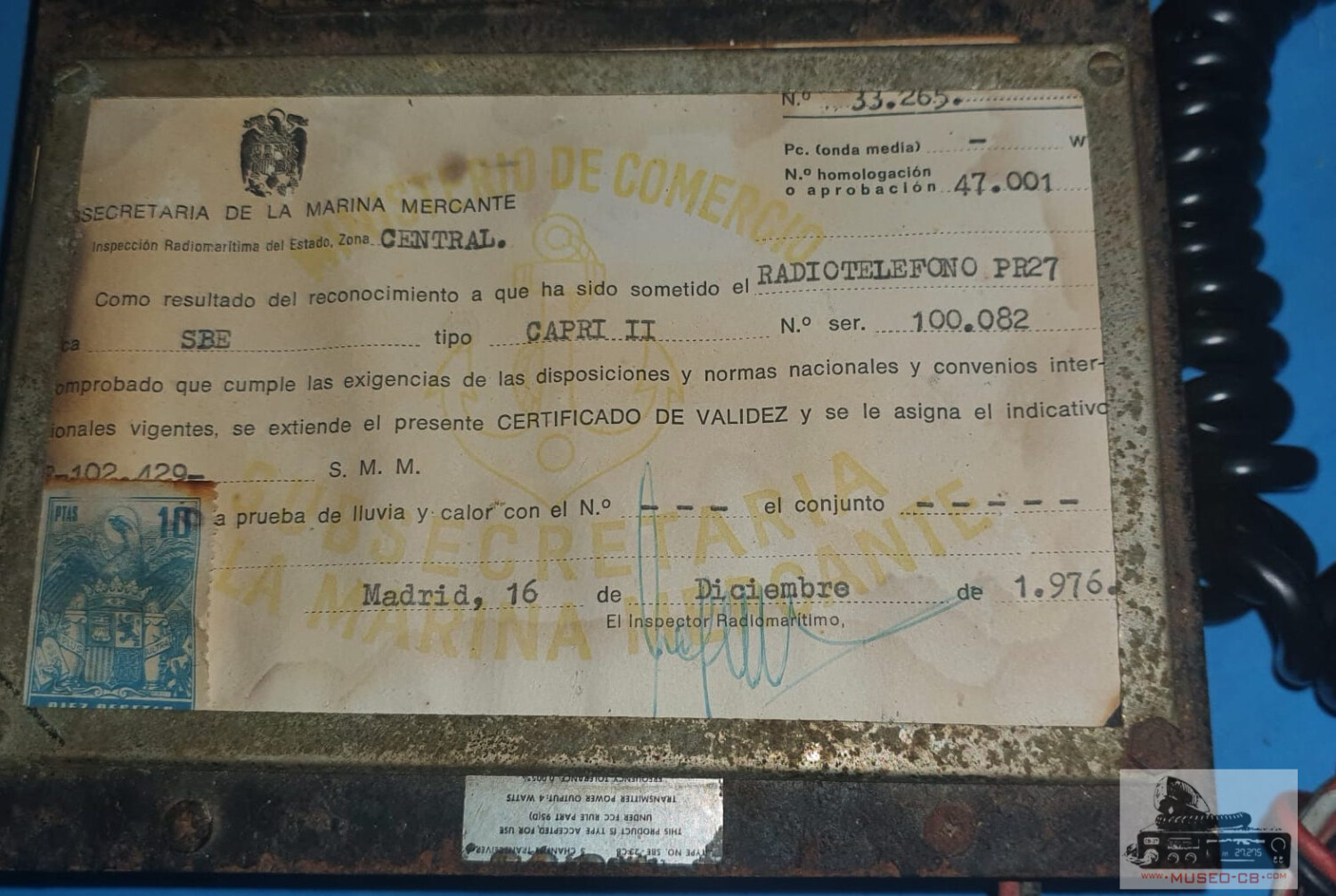 Permiso de la Secretaría de la Marina Mercante del año 1976 para el uso de una emisora SBE Capri II, con número de serie 100082, al que se asignó el indicativo F-102-429