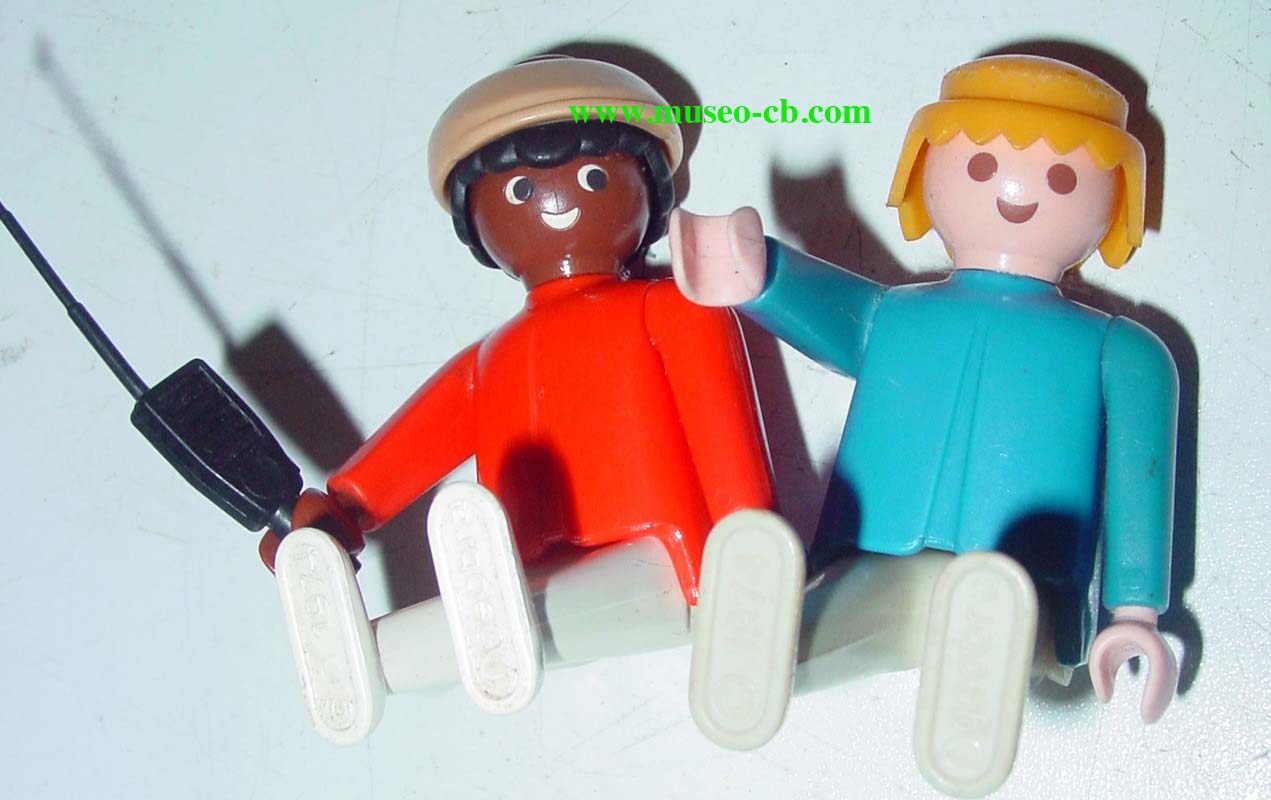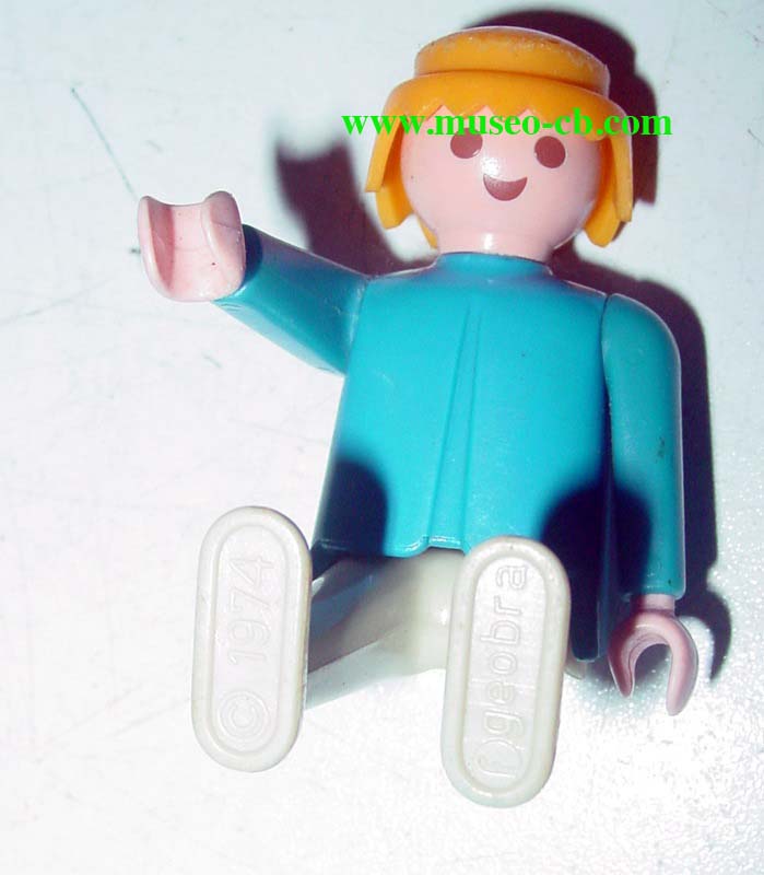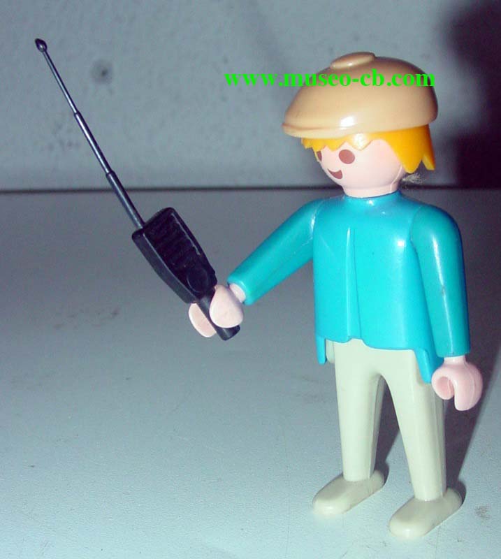Muñeco Playmobil de 1974, con la tez blanca y con un walki en las manos. La inscripción de la fecha de fabricación la lleva en la suela del zapato.