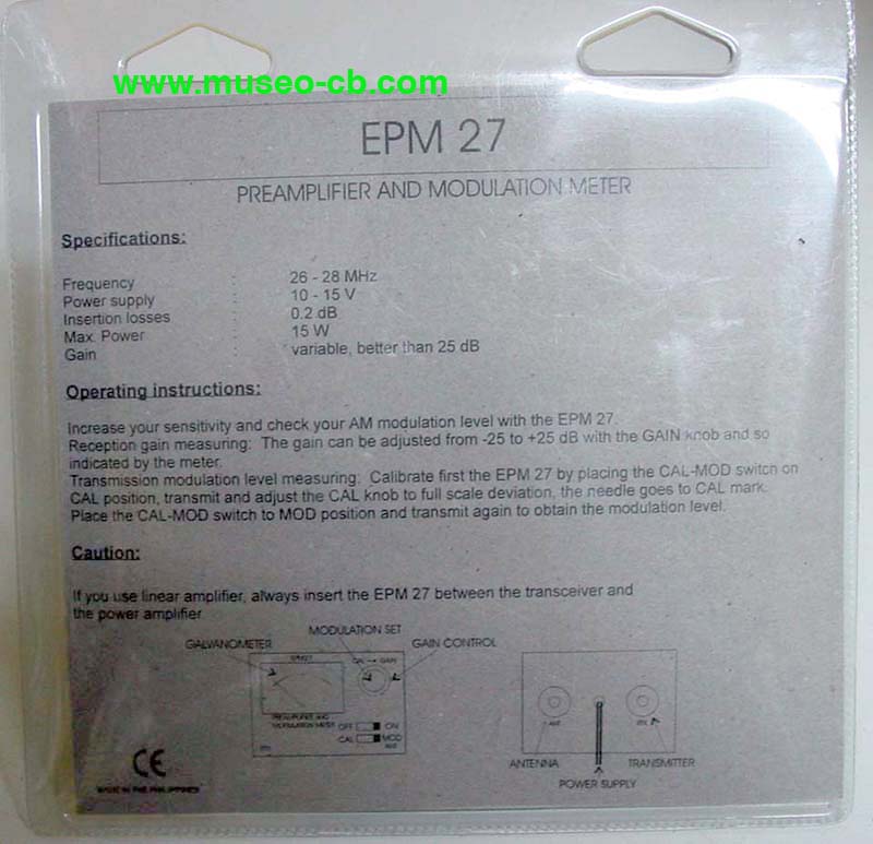 Preamplificador de recepción para 26-28 Mhz, con una ganancia de 25 db, y modulometro (indicador del tanto por ciento de modulación). Potencia máxima 15 watios y 0,2 db de pérdida de señal.