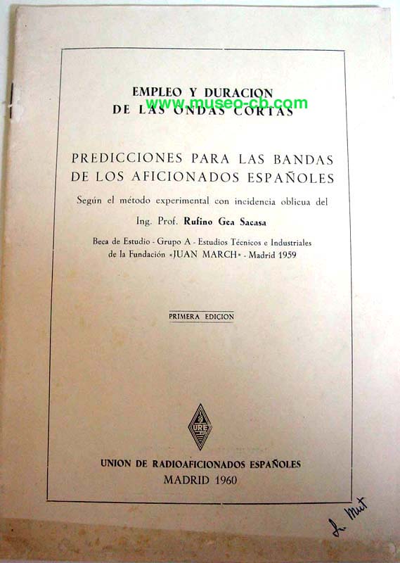 Documento editado por URE en 1960 con el título general "Empleo y Duración de las Ondas Cortas". Se trata de las "Predicciones para las bandas de los aficionados españoles según el método experimental con incidencia oblícua del ingeniero Profesor Rufino Gea Sacasa, que fue Beca de Estudio de la Fundación Juan March en 1959. En el libro, de 42 páginas sin ilustraciones, se predicen las condiciones de propagación en Onda Corta de España con el resto del mundo.
