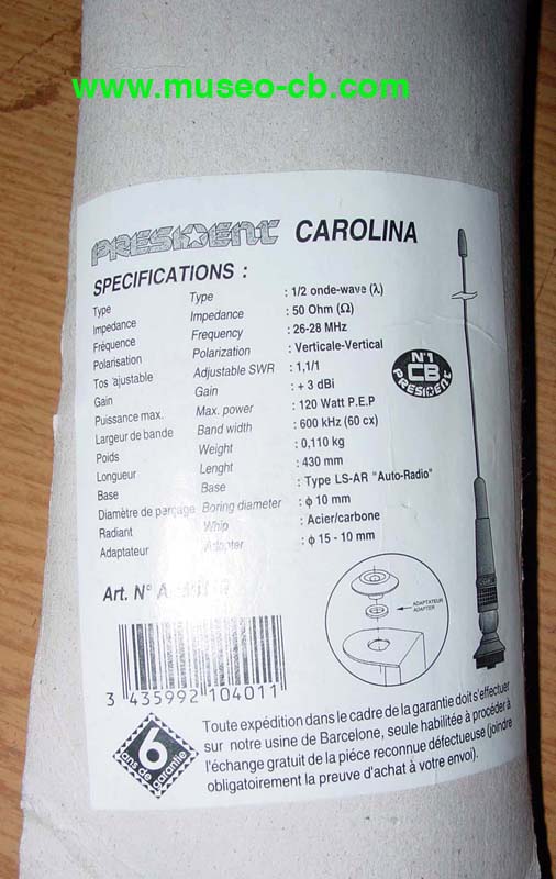 Antena nueva sin uso, de pequeño tamaño (longitud 430 mm). De media onda y con una potencia máxima de 120 watios PEP. 3 dbi de ganancia para CB.