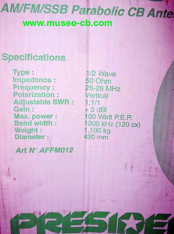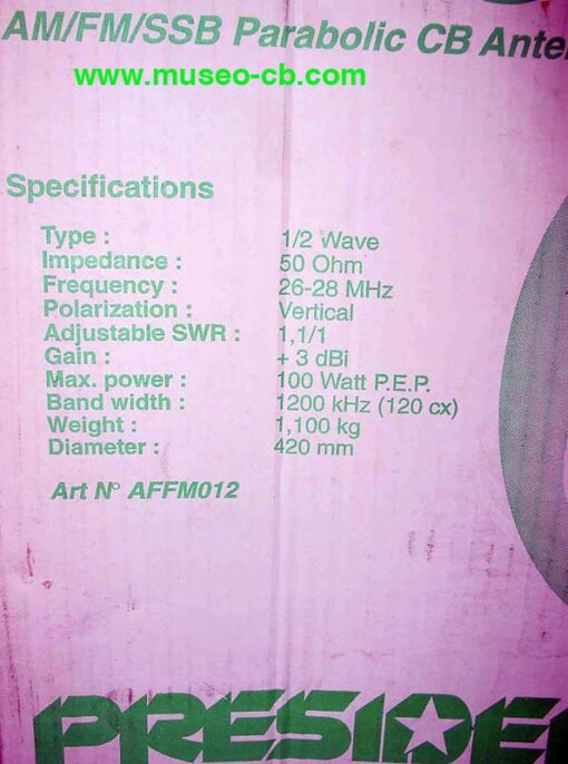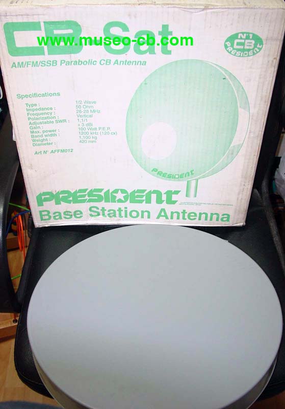 Antena de CB en forma de antena para recibir satélite (la conocida como paellera). Es de media onda y aunque su rendimiento no es excelente, al menos servía para poder transmitir a aquellos que tenían problemas para poner una antena "normal" de CB en el tejado. Está nueva sin uso y en su caja original.