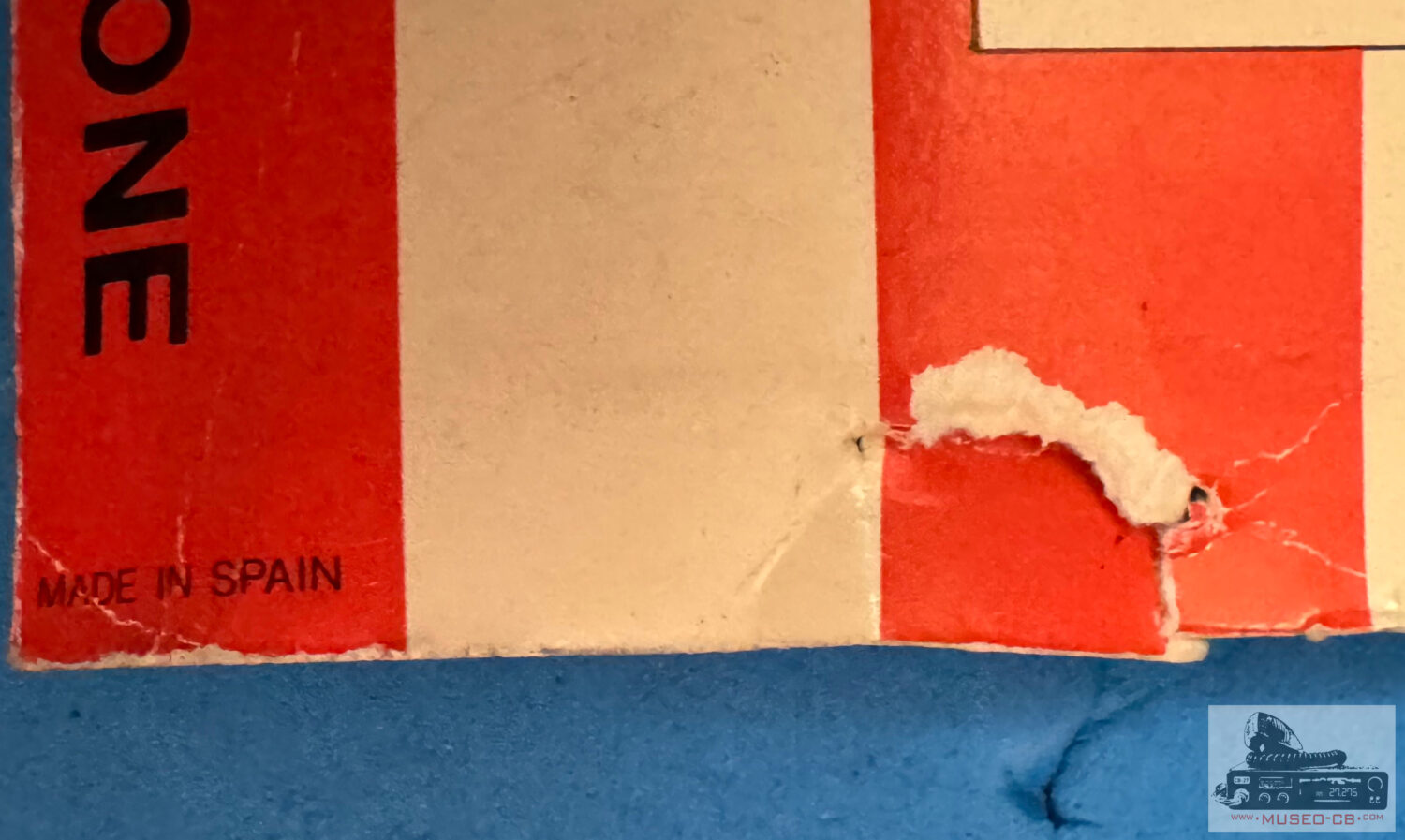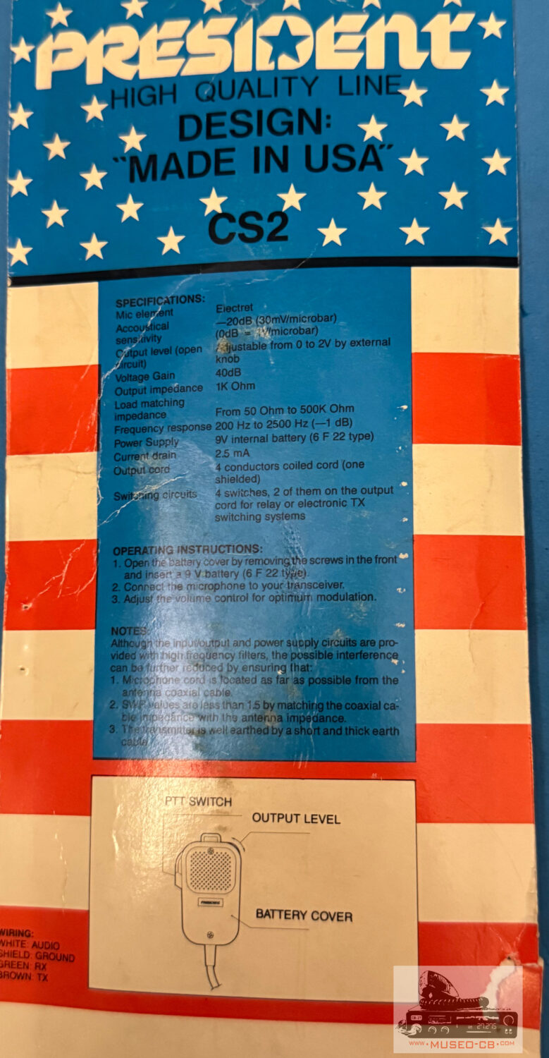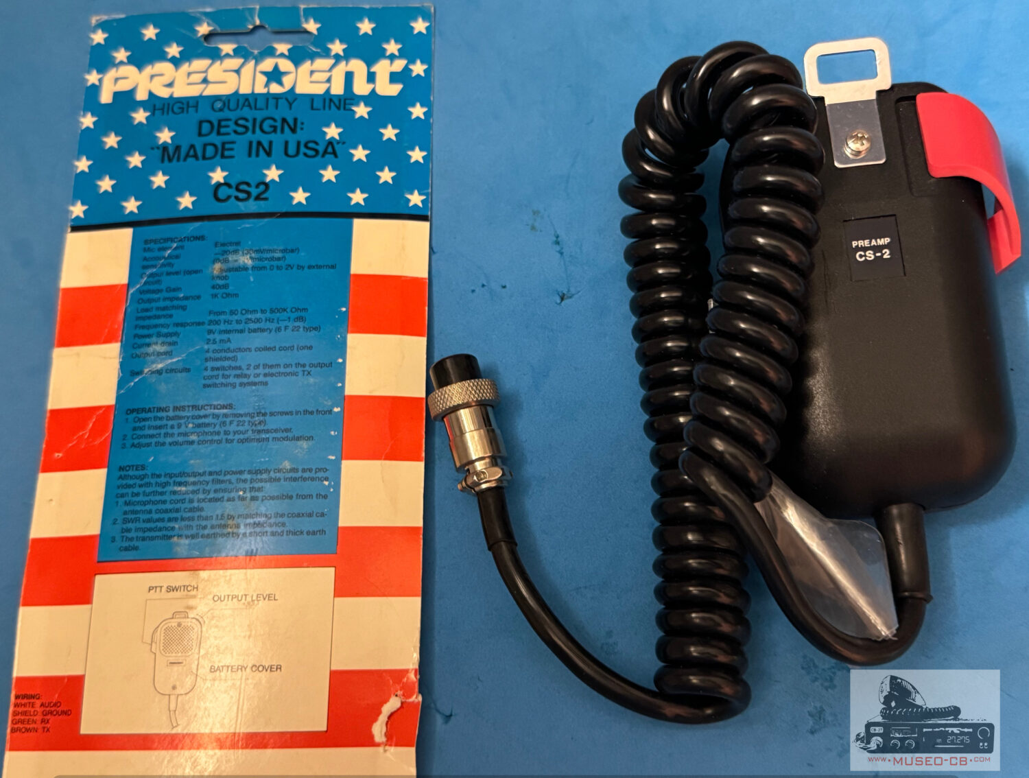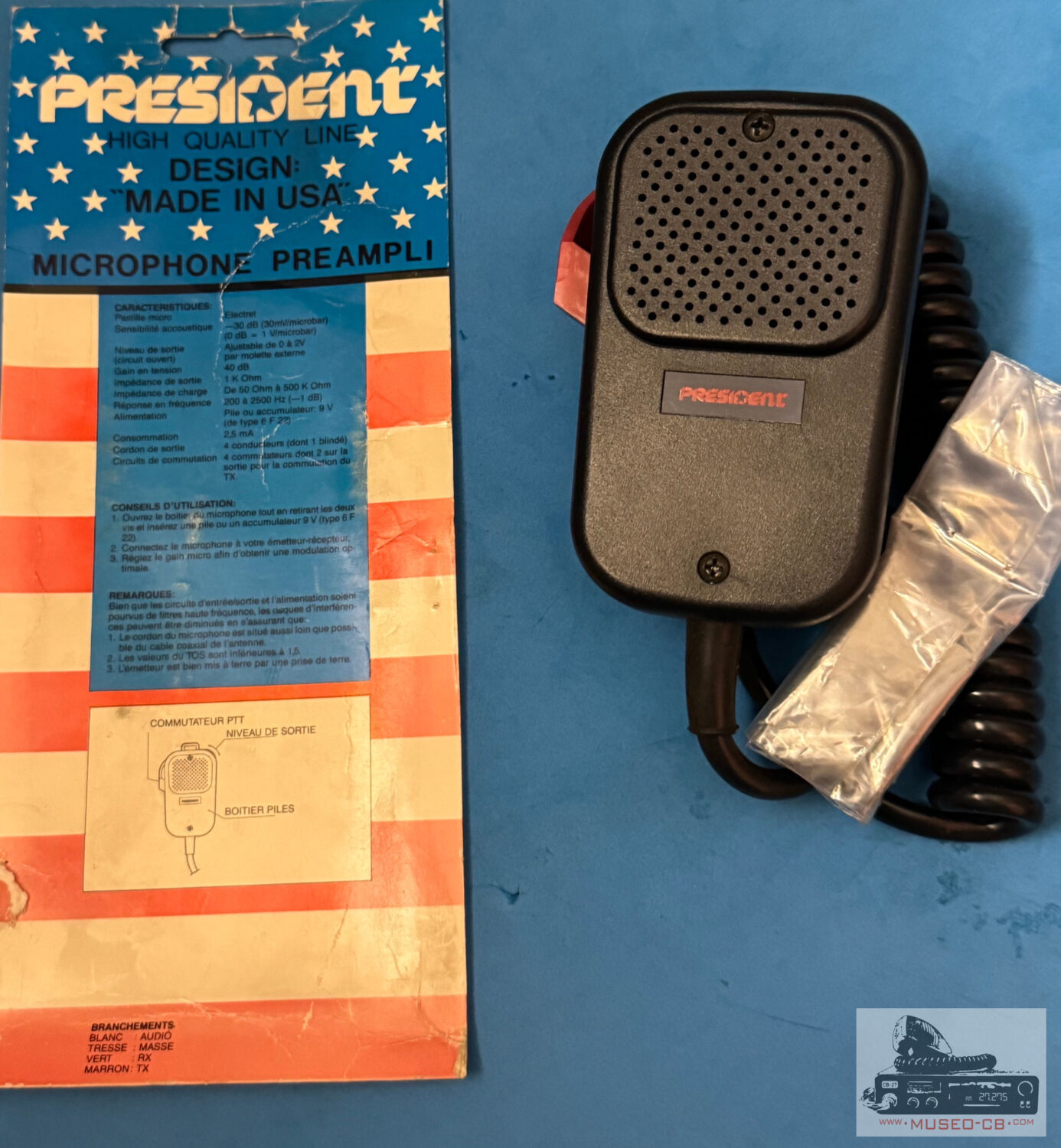 Micrófono amplificado President CS-2, fabricado en España, diseñado en Estados Unidos y vendido en Francia.