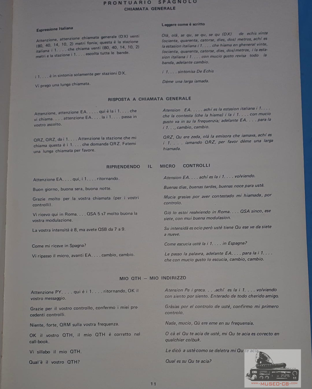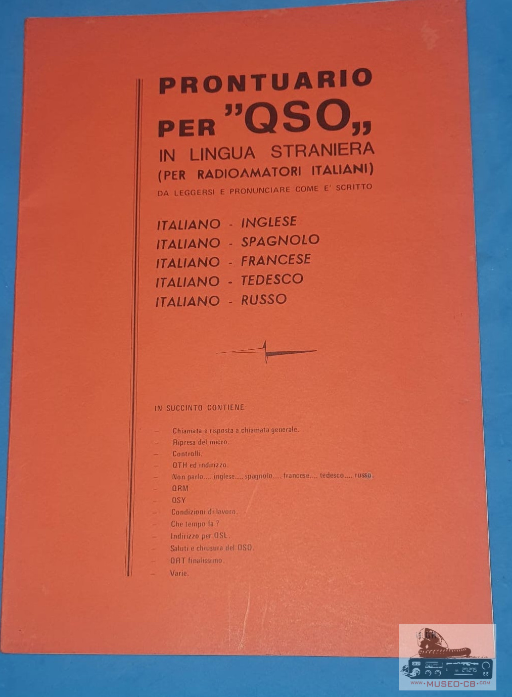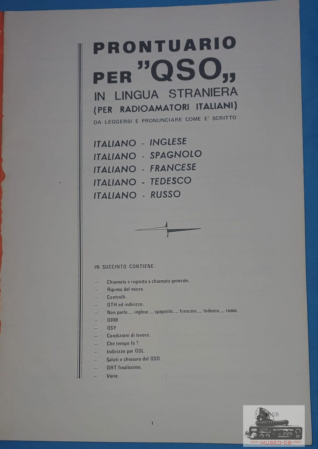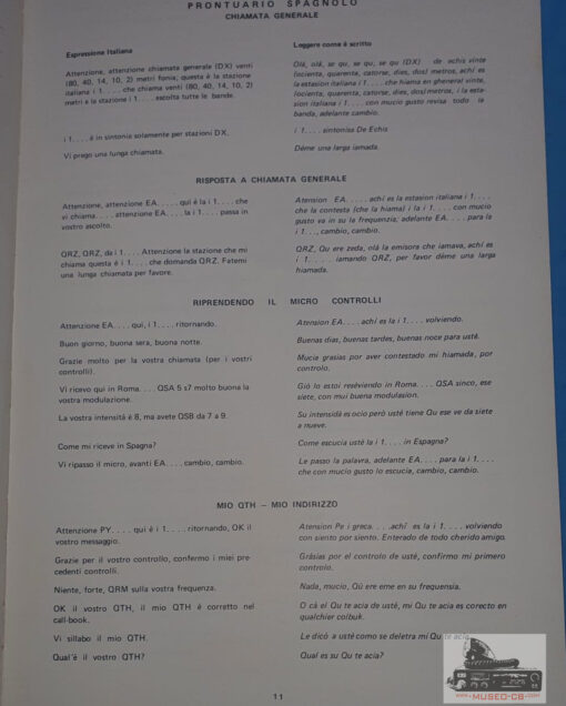 Libro italiano que ayuda a los radioaficionados italianos a comunicarse en Inglés, español, ruso francés y alemán.