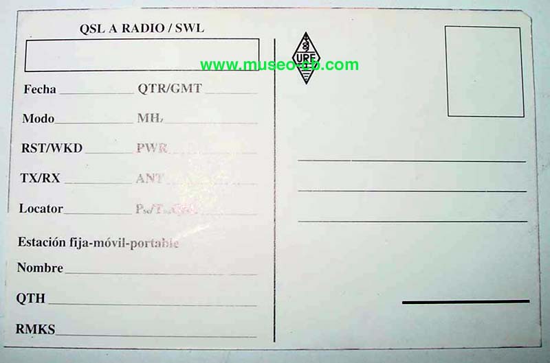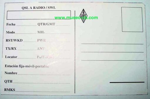 Típica tarjeta QSL de confirmación de contactos. Editada por la Unión de Radioaficionados Españoles (URE) para sus socios. Sin rellenar.