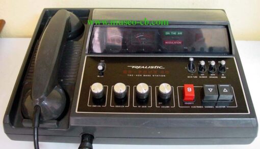 Equipo base con teléfono con micro y auricular. Incipiente tecnología digital, con control de canales mediante teclas de subir y bajar. Acceso directo al canal 9, dos s-meters, uno de ellos para medir estacionarias